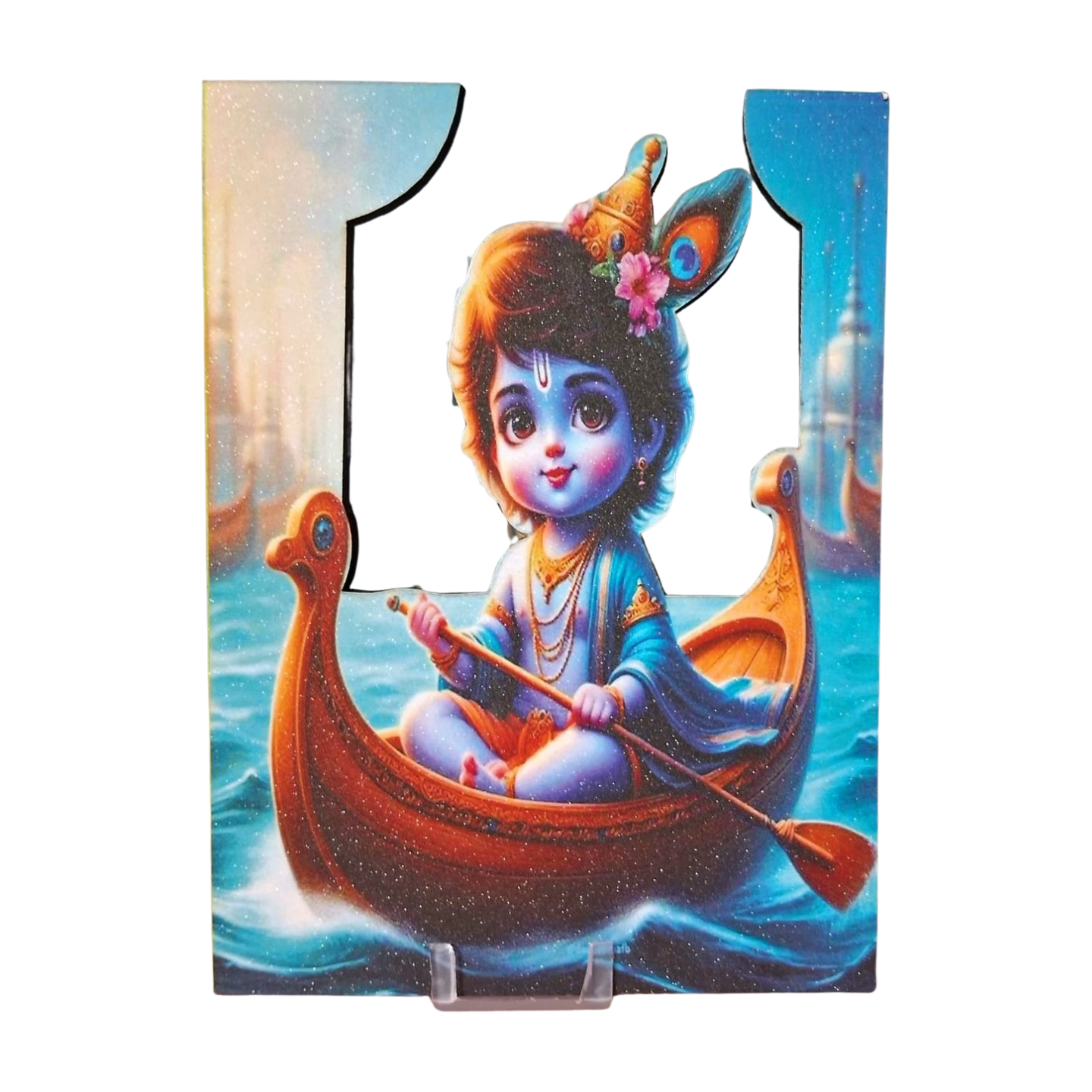 Laddu Gopal Ji Janmashtami Wooden Decoration Cutouts Kanha in Naav (6Inch)